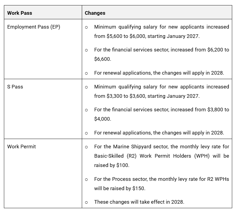 - Increased qualifying salary thresholds for work passes – To maintain the quality of the foreign workforce and ensure complementarity with the Singaporean core, qualifying salary thresholds will be raised across Employment Pass (EP), S Pass, and Work Permit categories.
