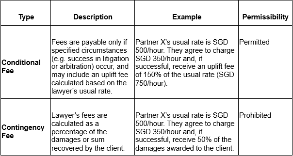 A conditional fee agreement refers to an agreement relating to all or part of the remuneration and costs in contentious proceedings, whether conducted in Singapore or elsewhere, under which a lawyer’s fees are payable only in specified circumstances. A conditional fee agreement may also include an uplift fee,[2] which is an additional amount payable upon achieving a successful outcome.